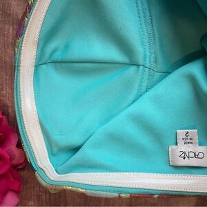 Elastic/silicone to hold top up. Balloon hem. Perfect condition with no stains, rips and a fully functional zipper.