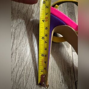 Step out in style with these colorful strappy heels. Featuring a bold mix of pink, orange, green, and yellow, these shoes are designed to turn heads.