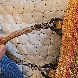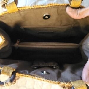 Beautiful straw purse/handbag. Dark brown lining with magnetic button closure. Macrame style handles with brown beading. Inside, this purse has two open sections divided by a more secure, zipped section. An additional zippered pocket and an elastic pouch round out the layout of this bag.