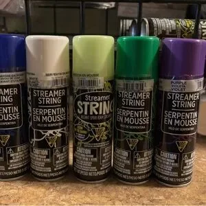 Set of vibrant streamer string cans. Includes purple, white, green, and blue colors. Perfect for parties and celebrations.