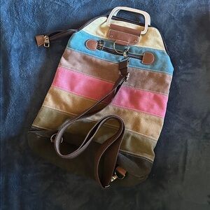 Stylish backpack with colorful stripes. Features a mix of blue, pink, brown, and tan colors. Perfect for everyday use.