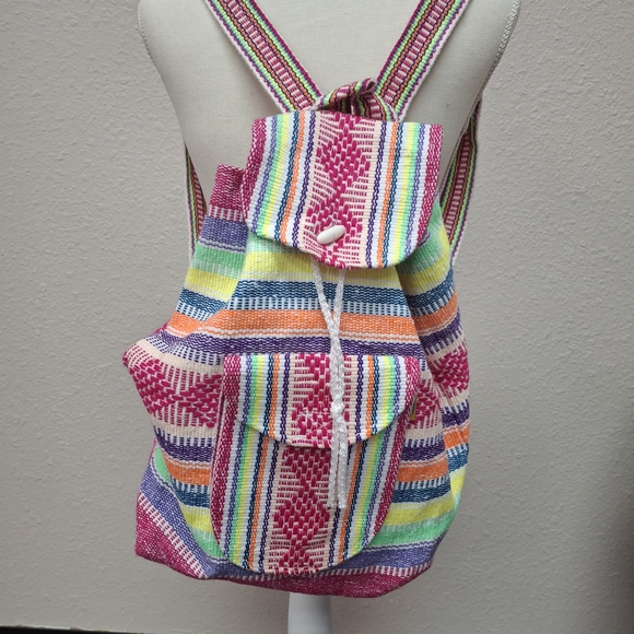 Colorful Stripped Backpack: - Made in Mexico - Small Pocket in the Front - Has drawstring and Button to secure - New but no Tags