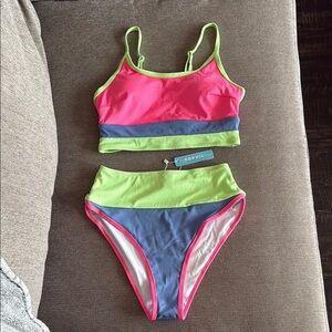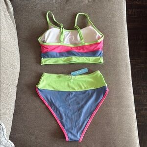 Dive into summer with this vibrant striped bikini set. Featuring bold neon colors, this swimwear is perfect for making a statement at the beach.