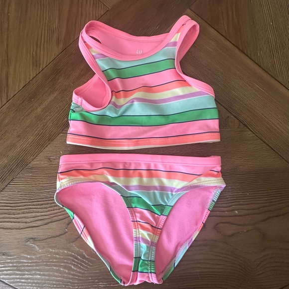 Vibrant bikini set with pink, green, and multicolor stripes.