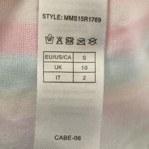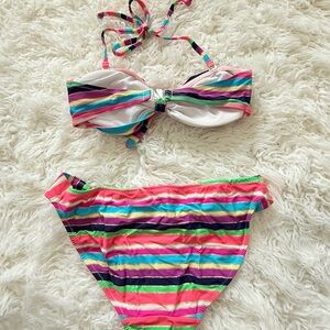 Vibrant colorful striped bikini set with halter top. Neck straps come off. Top is a little bit lighter than the bottoms due to sun.