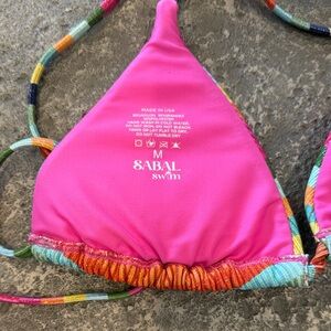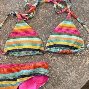 Vibrant and stylish, this colorful striped bikini set is perfect for a day at the beach. Featuring a mix of bright hues, it offers a fun and playful look. Enjoy comfort and style with this eye-catching swimwear.