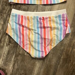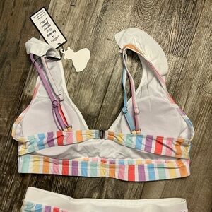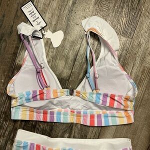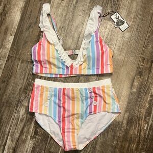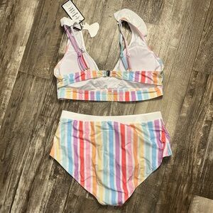 Vibrant and stylish, this colorful striped bikini set is perfect for a day at the beach. Featuring a playful mix of pink, orange, yellow, blue, and white stripes, it offers a fun and trendy look. The ruffled top adds a touch of elegance, making it a must-have for your swimwear collection.