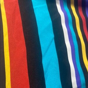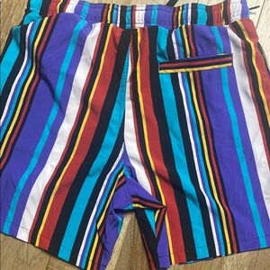 Bright shorts featuring vibrant stripes and a drawstring waist. Measures 32 inches.