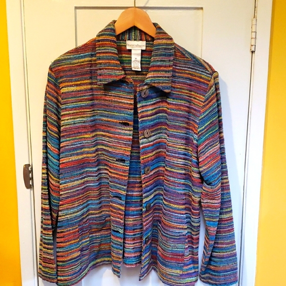 Missoni-inspired vibrant striped jacket with a mix of colors. cotton poly rayon blend. made in India