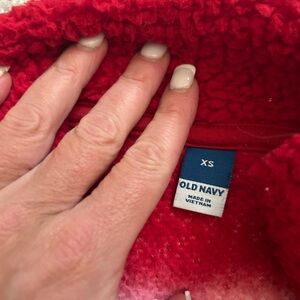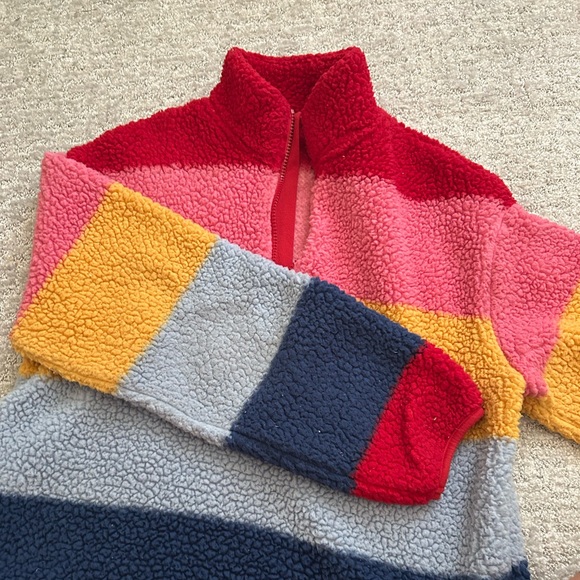 Vibrant jacket with red, pink, yellow, blue, and gray stripes. Cozy and stylish for x small