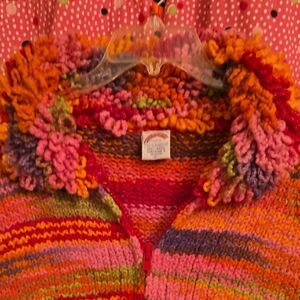 Vibrant knit sweater with multicolored stripes. Features a cozy design with a textured finish.