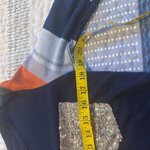 Elevate your style with this vibrant long sleeve top featuring colorful striped sleeves and a dazzling gold pocket. Perfect for any occasion.