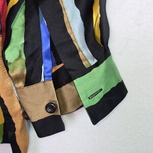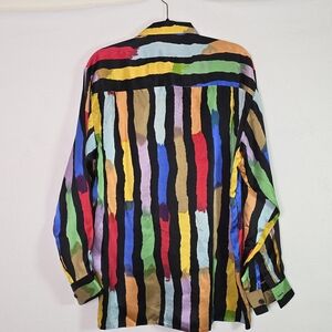 Turn heads with this bold and artistic Genelli 100% silk shirt in a stunning multicolor vertical stripe print. The smooth, luxe silk fabric drapes beautifully and feels incredibly soft on the skin. Perfect for making a statement at parties, events, or stylish nights out.