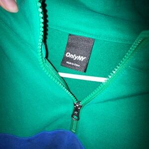Vibrant pullover with green, blue, and yellow stripes. Features a front zipper.