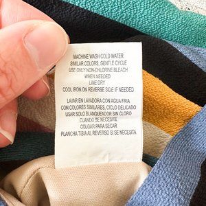 Fun and colorful striped romper. Sleeveless, v-neck with keyhole button closure on back. Bow belt at waist. Great material and dressy for weddings!