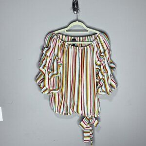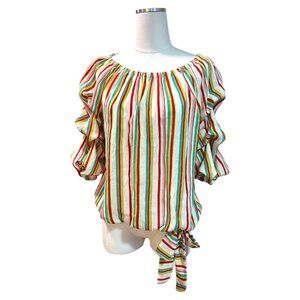 Colorful Striped Ruffle Sleeve Peasant Blouse Large Tie Hem Boho Festival Top