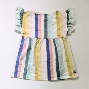 Tea Collection Vibrant striped dress with ruffle sleeves. Features a mix of pastel colors, perfect for spring and summer. size 12-18m. Easily transitions to a top as baby grows! VGUC, little to no evidence of wear.