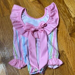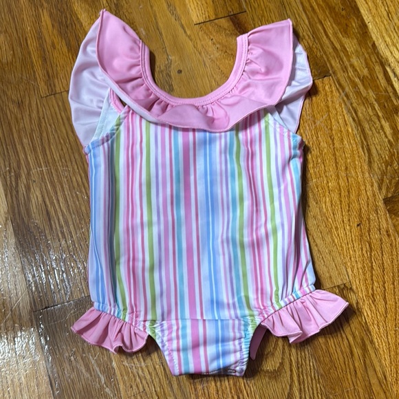 Adorable swimsuit with pink ruffle sleeves. Features colorful stripes in pink, blue, green, and white.