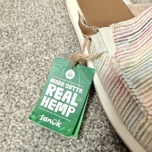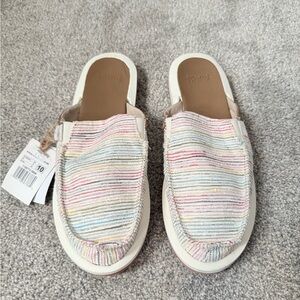 Stylish Sanuk slip-ons with colorful stripes. Perfect for casual wear. NWT