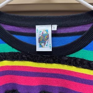 Queen of Sparkles Vibrant sweater with multicolor stripes. Features shades of pink, orange, yellow, green, blue, and black.