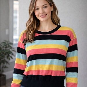 Vibrant sweater with bold stripes in pink, yellow, blue, and black. Perfect for adding a pop of color to your wardrobe.