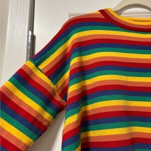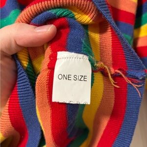 Brighten your wardrobe with this vibrant striped sweater. Featuring bold colors, it's perfect for making a statement. Labeled as one size, probably closest to a large.