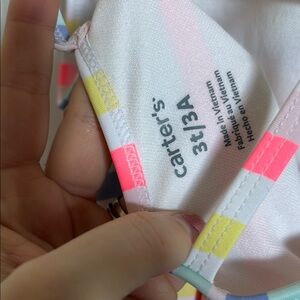NEVER WORN- Vibrant striped swimsuit with ruffle detail. Features pink, blue, green, and yellow stripes.