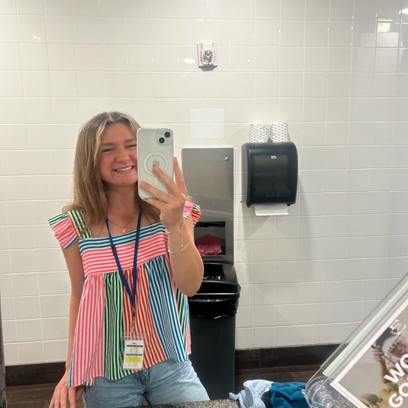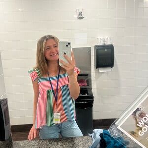 Vibrant striped top with cap sleeves. Features a mix of colors for a playful look.
