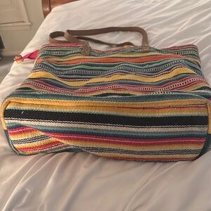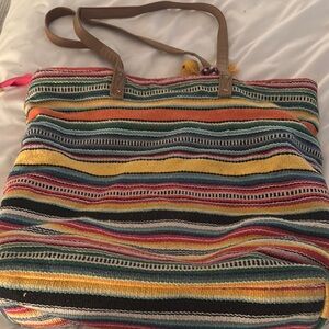 Vibrant and stylish, this colorful striped tote bag is perfect for any occasion. Featuring a mix of red, orange, yellow, green, blue, and pink stripes, it adds a pop of color to your outfit. Ideal for daily use or a day at the beach.