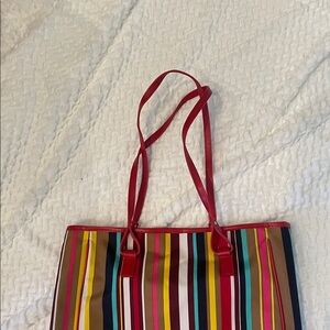 Vibrant tote bag with multicolor stripes. Features red handles.