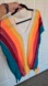 Brighten up your wardrobe with this vibrant V-neck swim cover-up featuring bold stripes in teal, red, orange, and yellow. Perfect for adding a pop of color to the beach or pool.