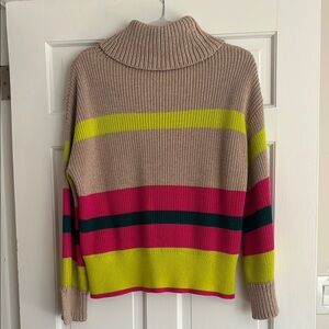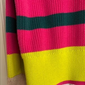 Stay cozy and stylish with this vibrant striped sweater. Featuring a mix of tan, pink, and green colors, it's perfect for adding a pop of color to your wardrobe.
