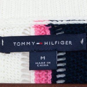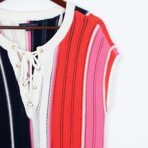 Vibrant and stylish, this women's sweater features bold stripes in red, pink, navy, and white. Perfect for adding a pop of color to your wardrobe.