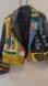 Vibrant leather jacket with studded details. Features a mix of colors including black, yellow, purple, and green. Eye-catching patches and designs.