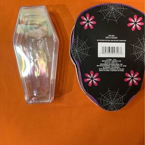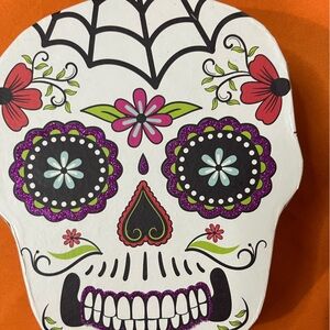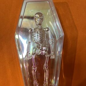 Vibrant sugar skull with floral designs and an iridescent skeleton in a coffin-shaped case. Perfect for festive decor.