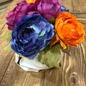 Add a vibrant touch to your decor with this colorful floral skull accent. Featuring vivid orange, purple, and blue flowers, this piece is perfect for adding a splash of color to any room.