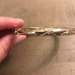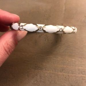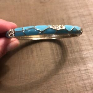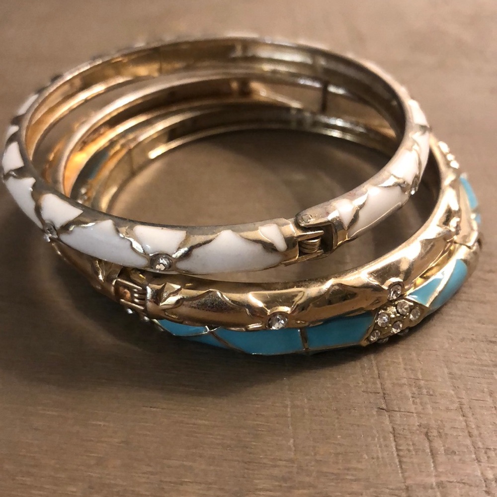 Set of three bangles: gold, white and turquoise with small rhinestone accent. These make for the perfect summer accessory, pairing with anything from denim to sundresses. They hinge bracelets, to easy to take on or off.