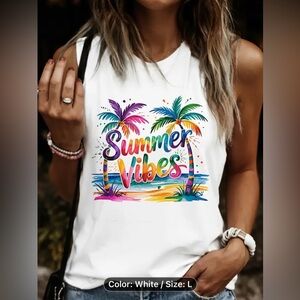 Embrace the season with this vibrant 'Summer Vibes' tank top. Perfect for casual outings, this top features a colorful design that adds a splash of fun to your wardrobe.