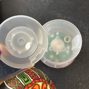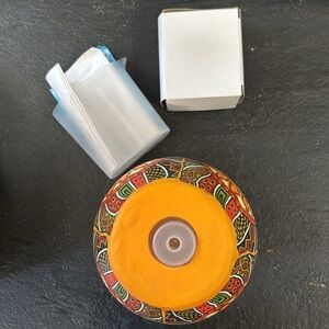 Vibrant candle holder with a sun design. Features red, yellow, and green patterns. Perfect for adding a pop of color to any space.
