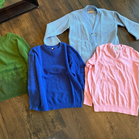A vibrant collection of sweaters in green, blue, pink, and light blue. Perfect for adding color to your wardrobe.