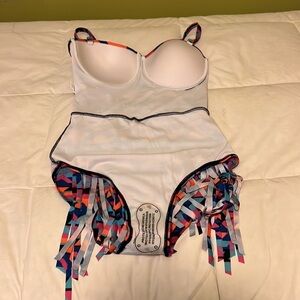 Ok wanna have fun in the sun and look amazing too! This swim suit is so colorful fun and sexy all at the same time. It has underwire, straps are removable and the protection stipe is still in place as well as the tag. You’ll enjoy the way this swimsuit makes you look.