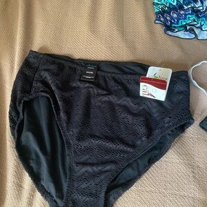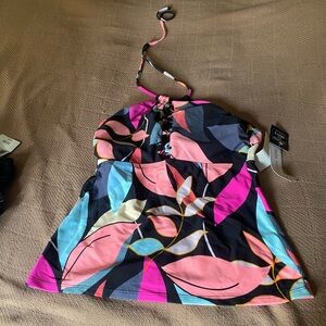Vibrant swimwear set featuring black, blue, and multicolor patterns. Perfect for a stylish beach day.