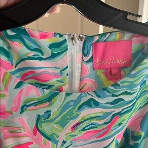Vibrant dress with a swirl pattern. Features shades of pink, green, and blue. Perfect for a lively look.