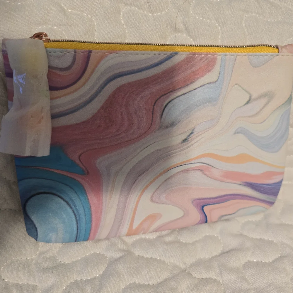 Vibrant pouch with a swirl pattern. Features pink, blue, and cream colors. Perfect for organizing essentials.