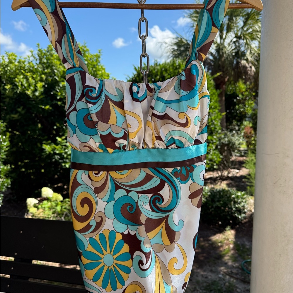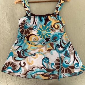 Vibrant top with a swirl pattern in blue, brown, and yellow hues. Built-in bust enhancement for subtle lift. Size M by A. Byer.