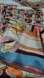 Vibrant two-piece set with a swirl pattern. Features shades of orange, blue, and cream.