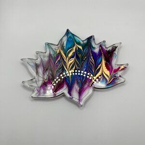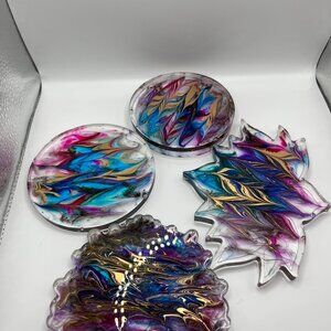Add a burst of color to your space with this 4 piece hand-poured resin coaster featuring a vibrant marbled swirl pattern in gold, blue, pink, purple, and white. Each piece is uniquely crafted with a high-gloss finish and rich pigments that shimmer in the light. Ideal as a bold accent for your coffee table, desk, or as a unique gift.