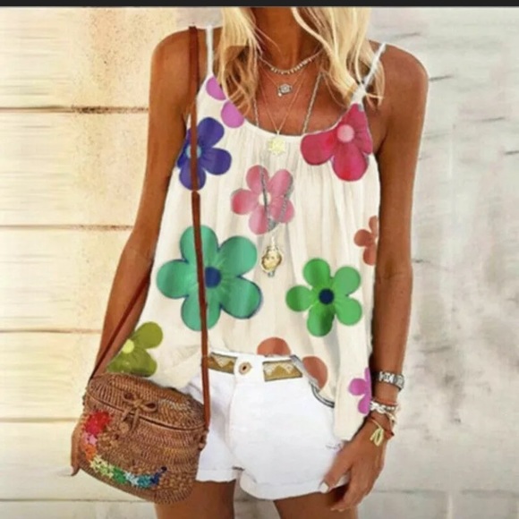 CReam w colorful Flowers. Peplum hem. 36” bust. See size chart for detailed measurements
