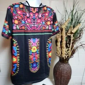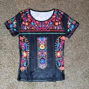 Black short sleeve Tshirt, loaded with color! Scoop neck. Lightweight and soft.