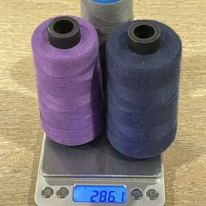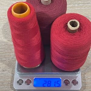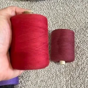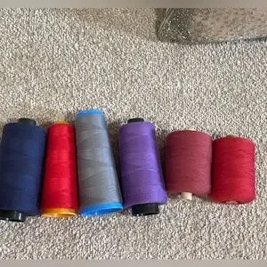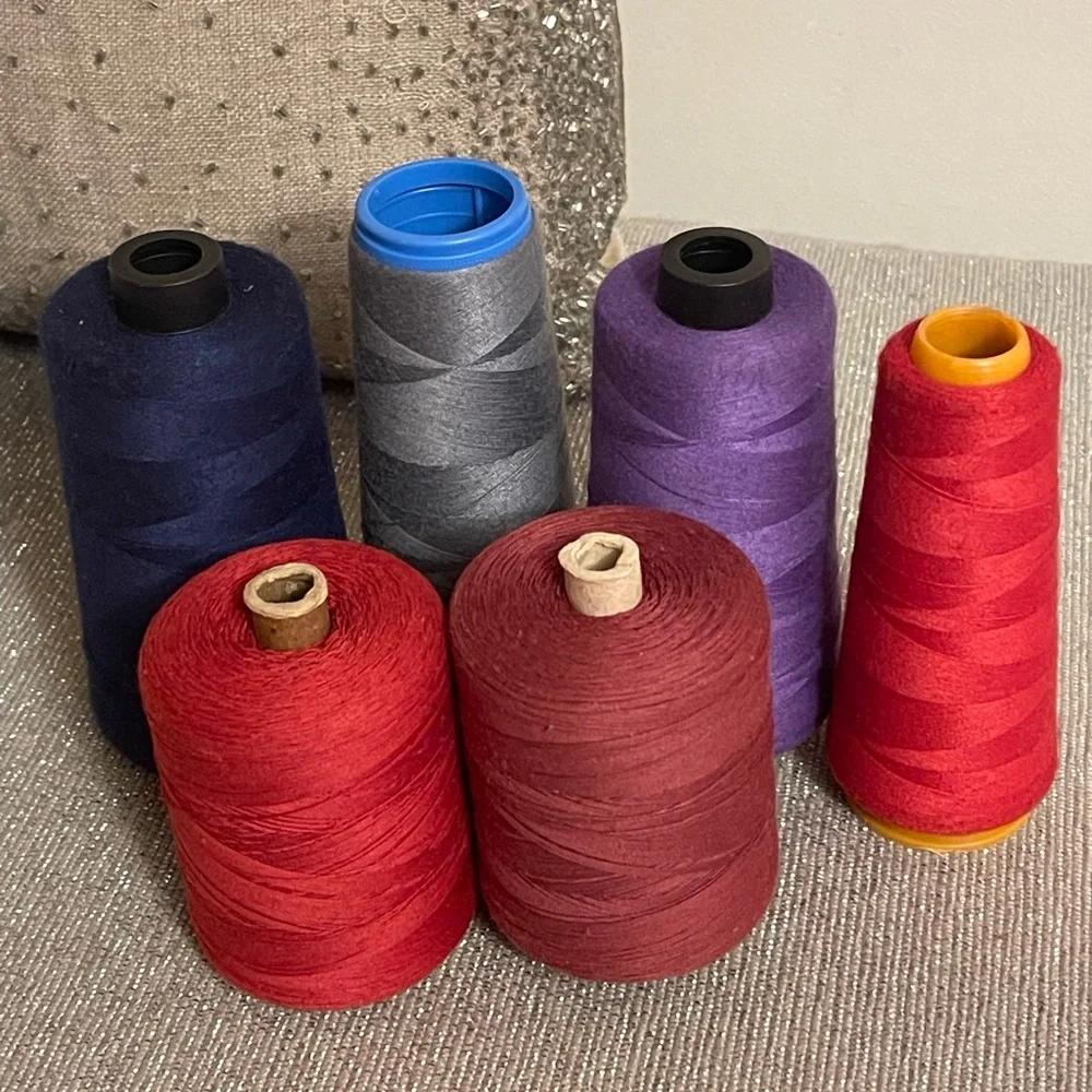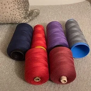 Set of vibrant thread spools in red, burgundy,blue, purple, and gray.